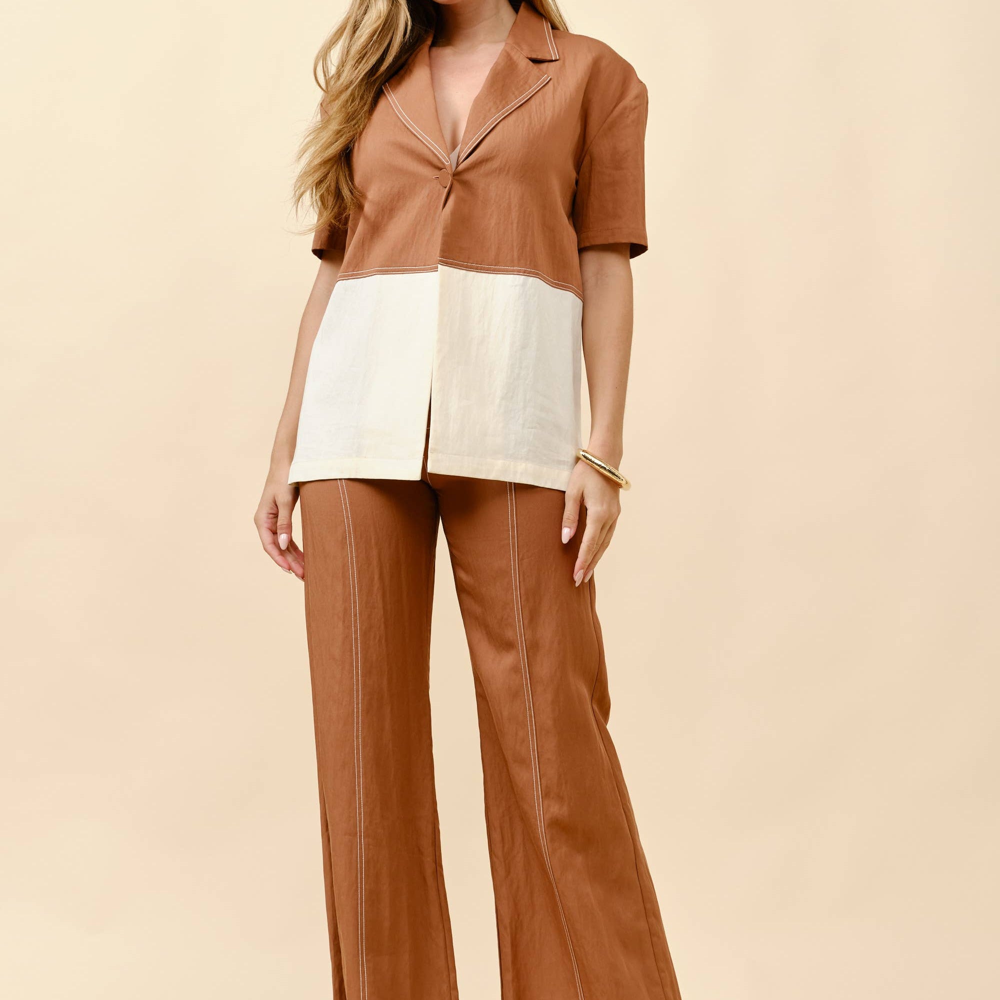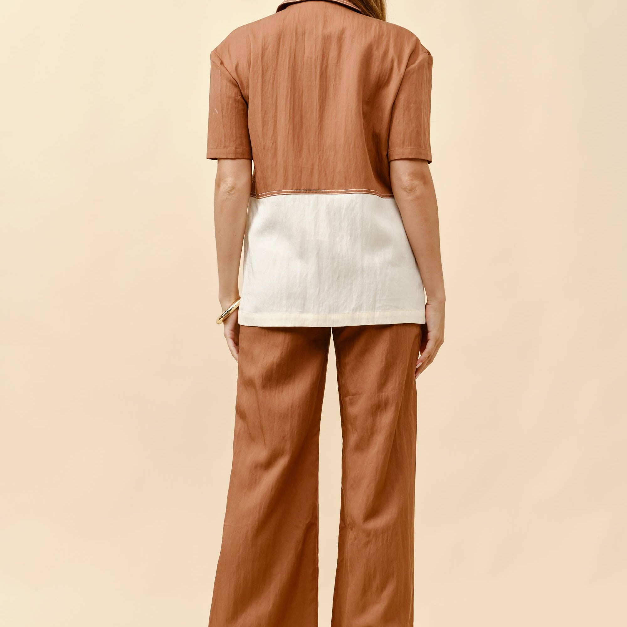 Color block short sleeve button up top and pants set SELF:63%TENCEL 32%RAYON 5%NYLON LINING:100%POLYESTER Top, dresses, bottom, jackets, vests, blusas, vestidos, pantalon, blouse, metalico, metalic, sweater, sueter, bodysuits, shorts, skirts, lentejuela, satin, long sleeve, sacos, blazer, sexy dresses, romper, jumpsuit, knits, skort,midi dresses,corset