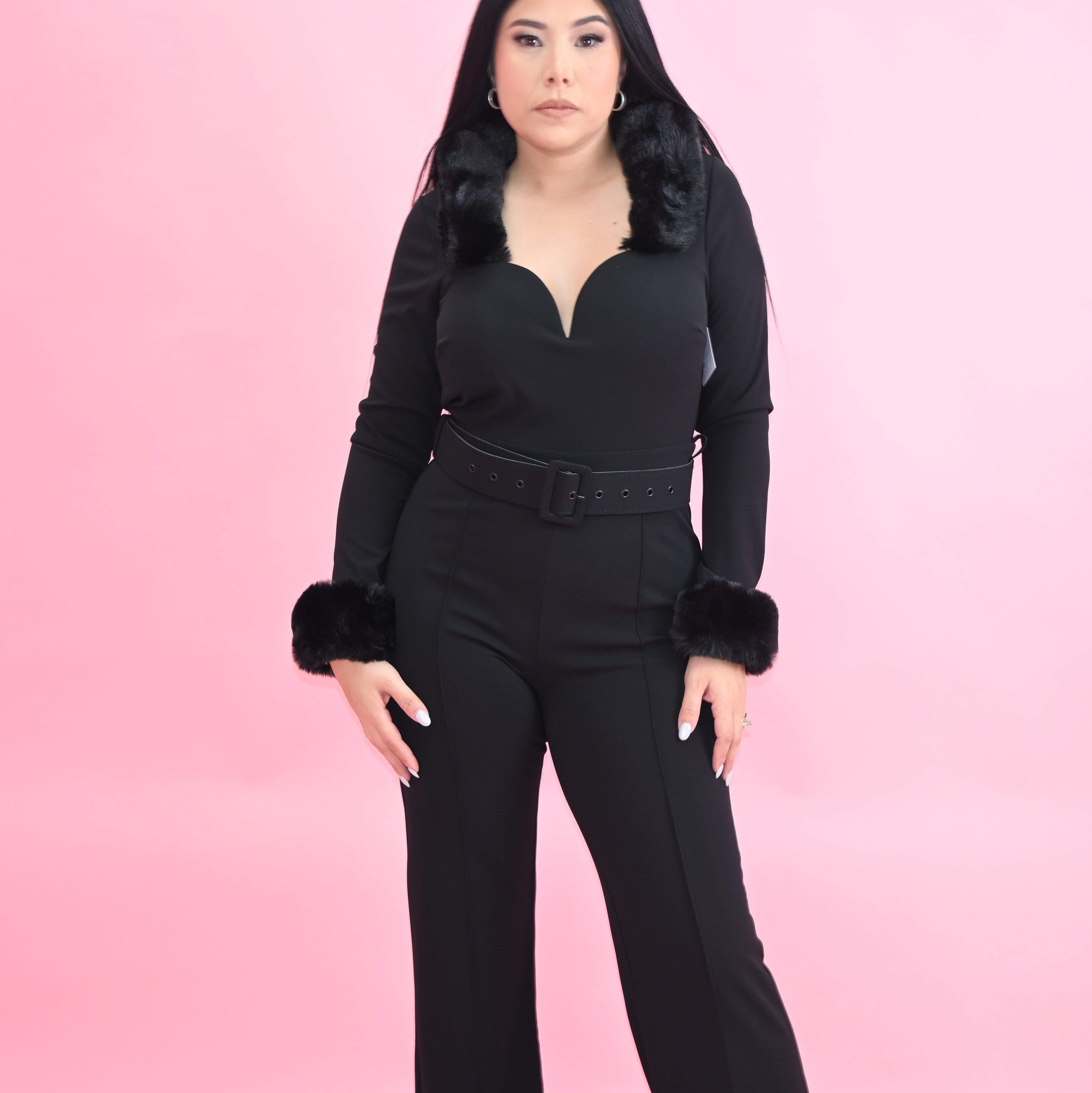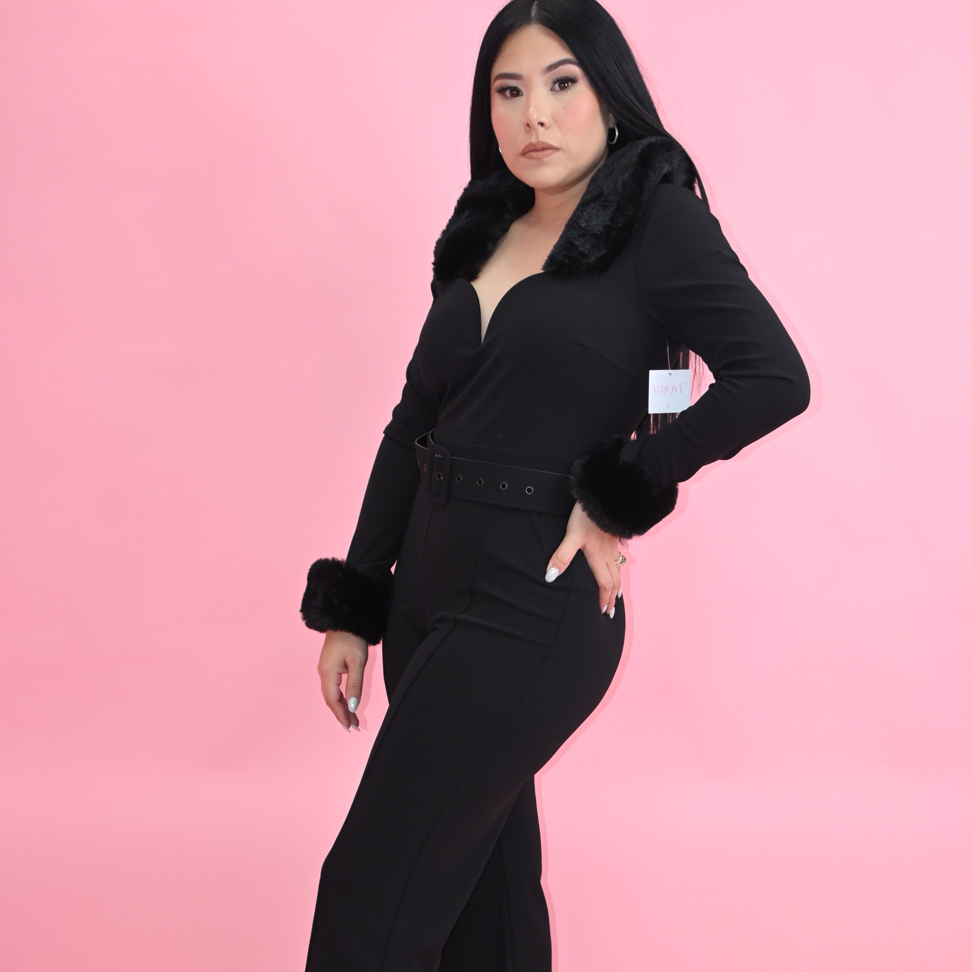 Jumpsuit negro con peluche en las mangas, corre a su talla estira muy poco la tela.