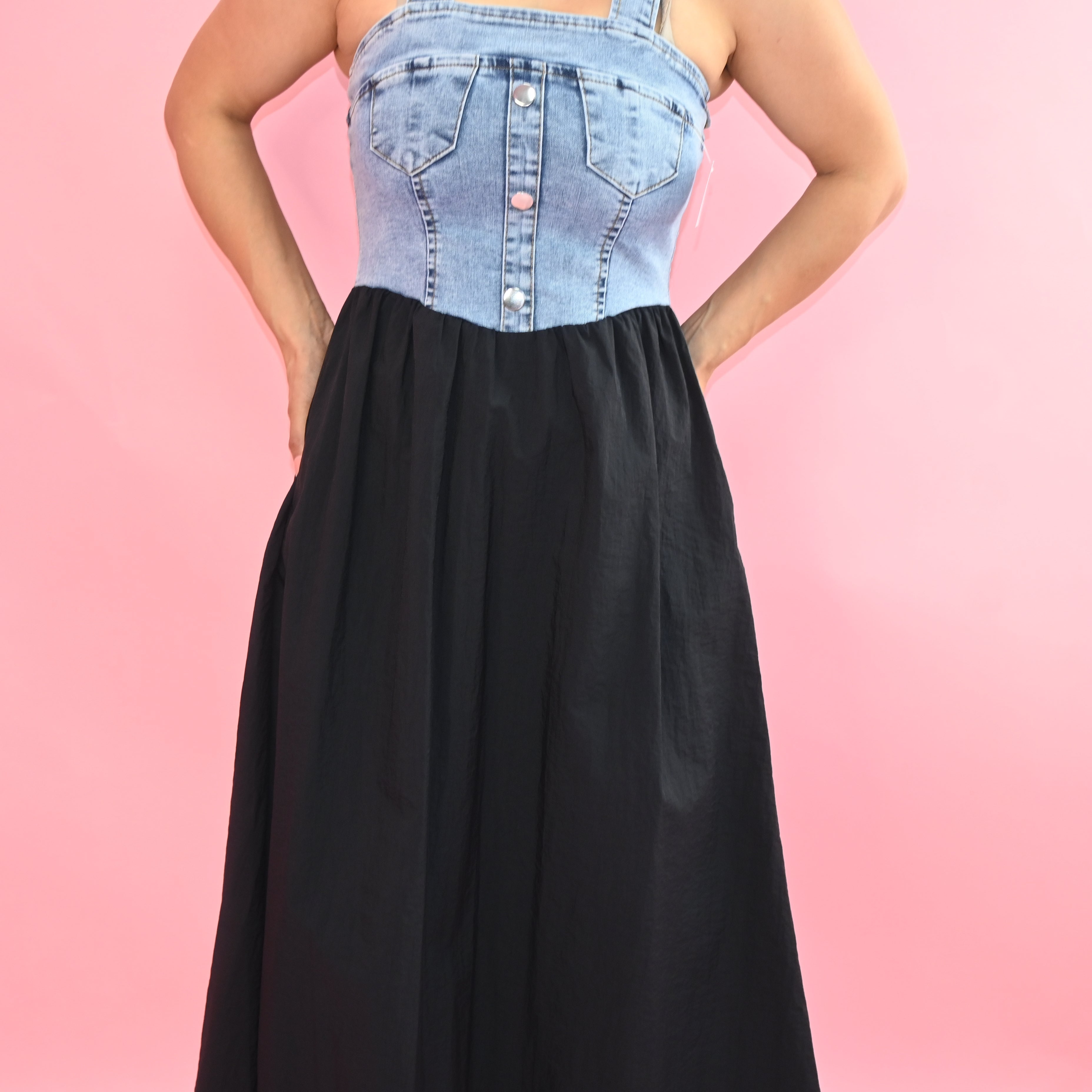 Vestido largo negro con mezclilla la tela no estira de arriba, corre a su talla.