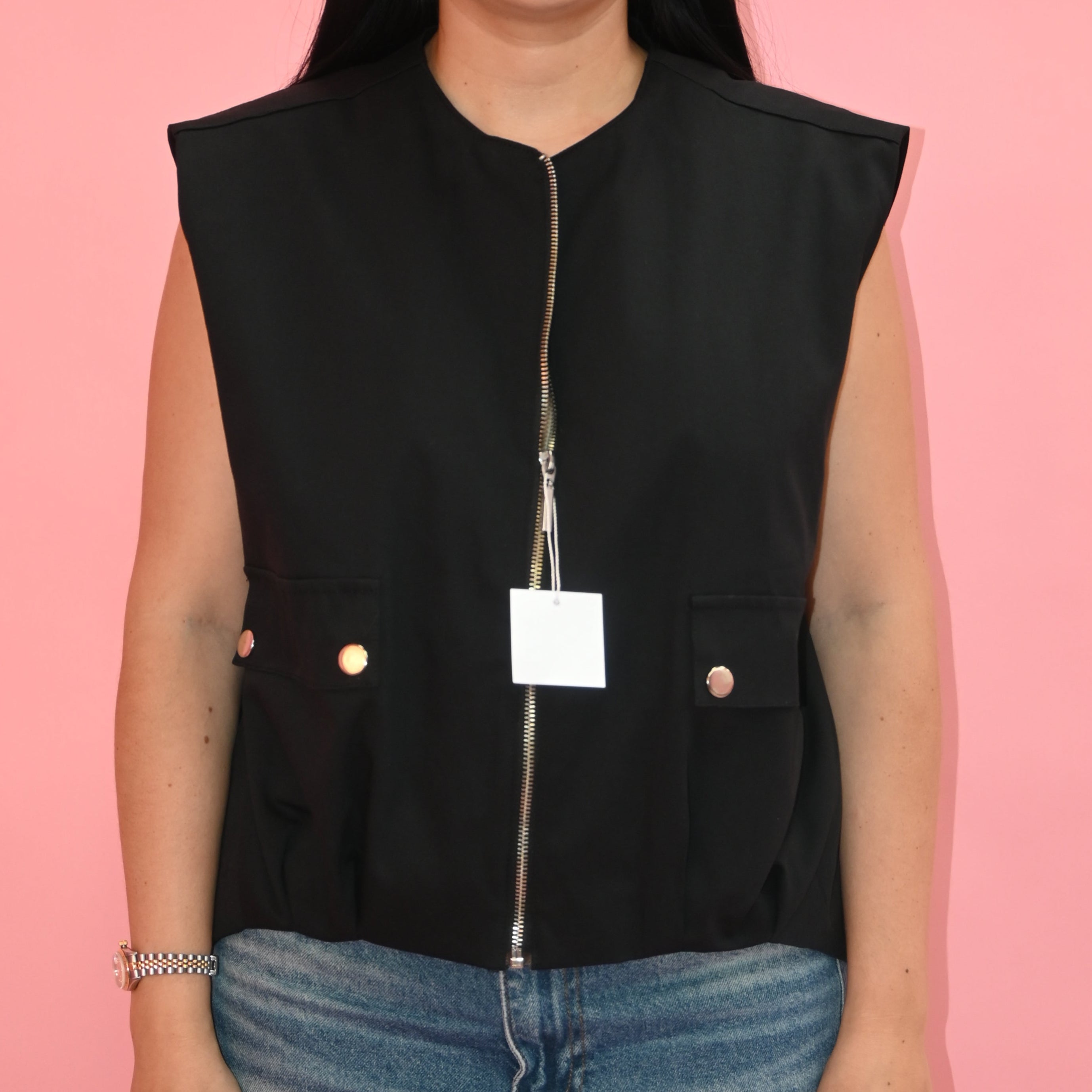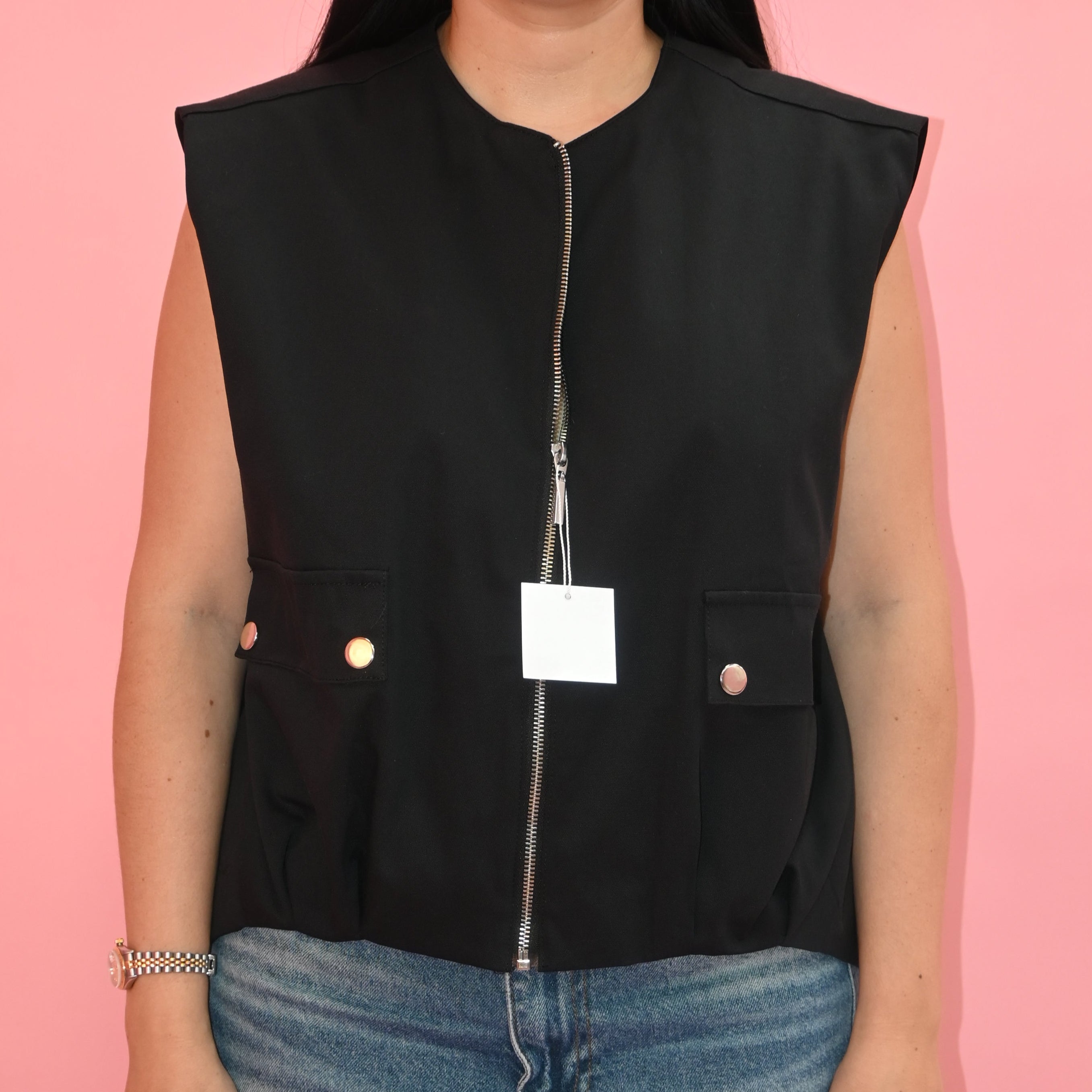 Chaleco negro corre ligeramente amplio, tiene ziper.