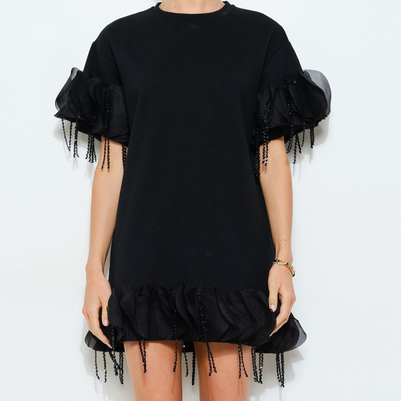 Vestido tipo bluson con diseno en piedras corre ligeramente amplio.