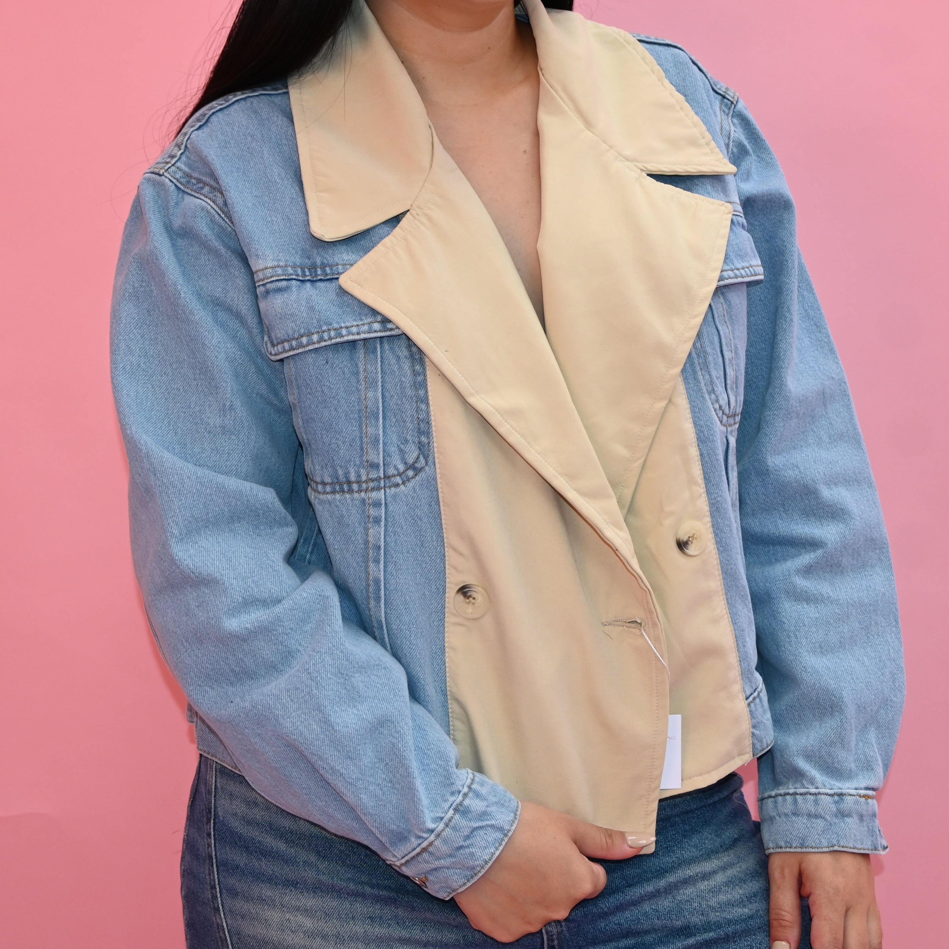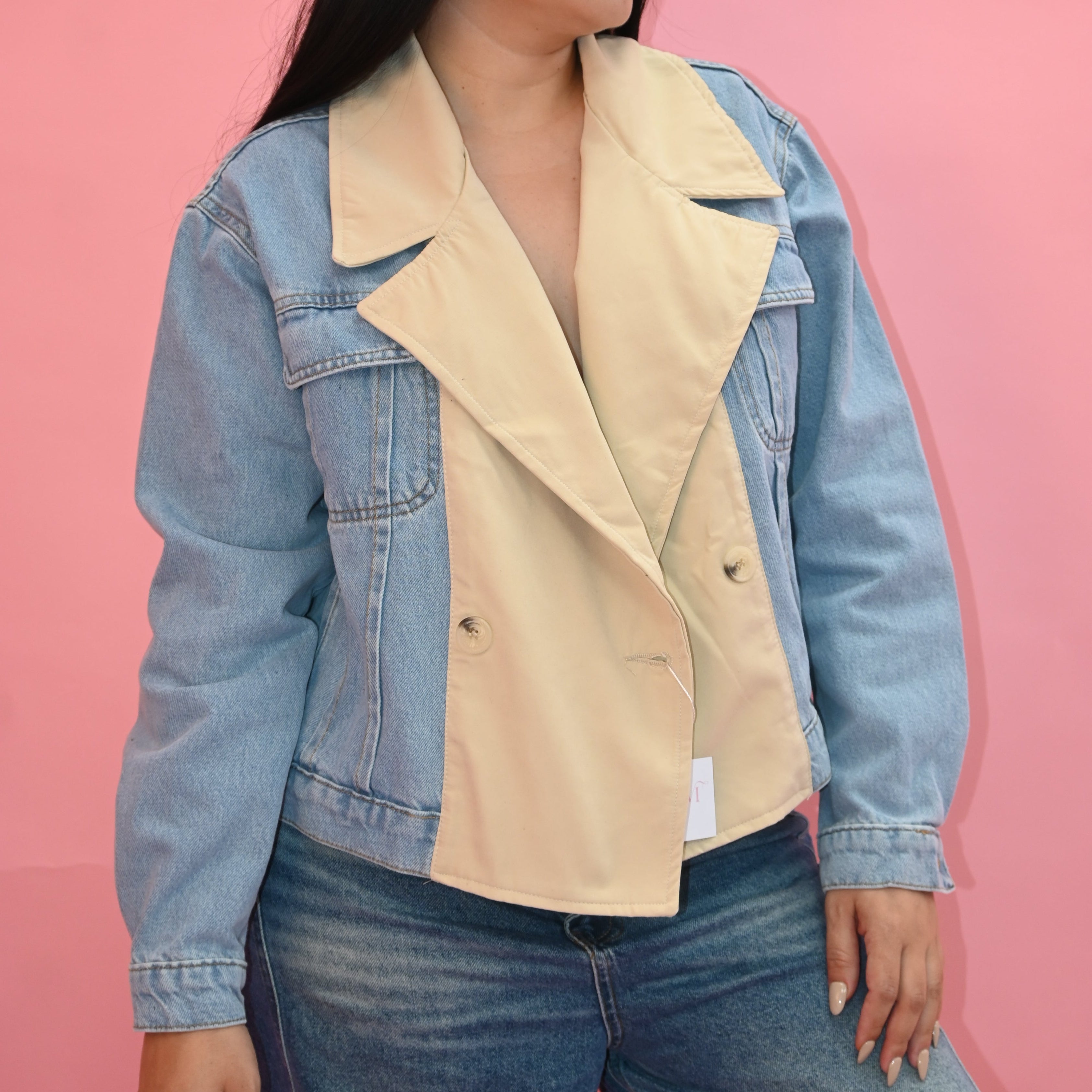 Chaqueta ligera de mezclilla con tela en color beich, su tela no estira.