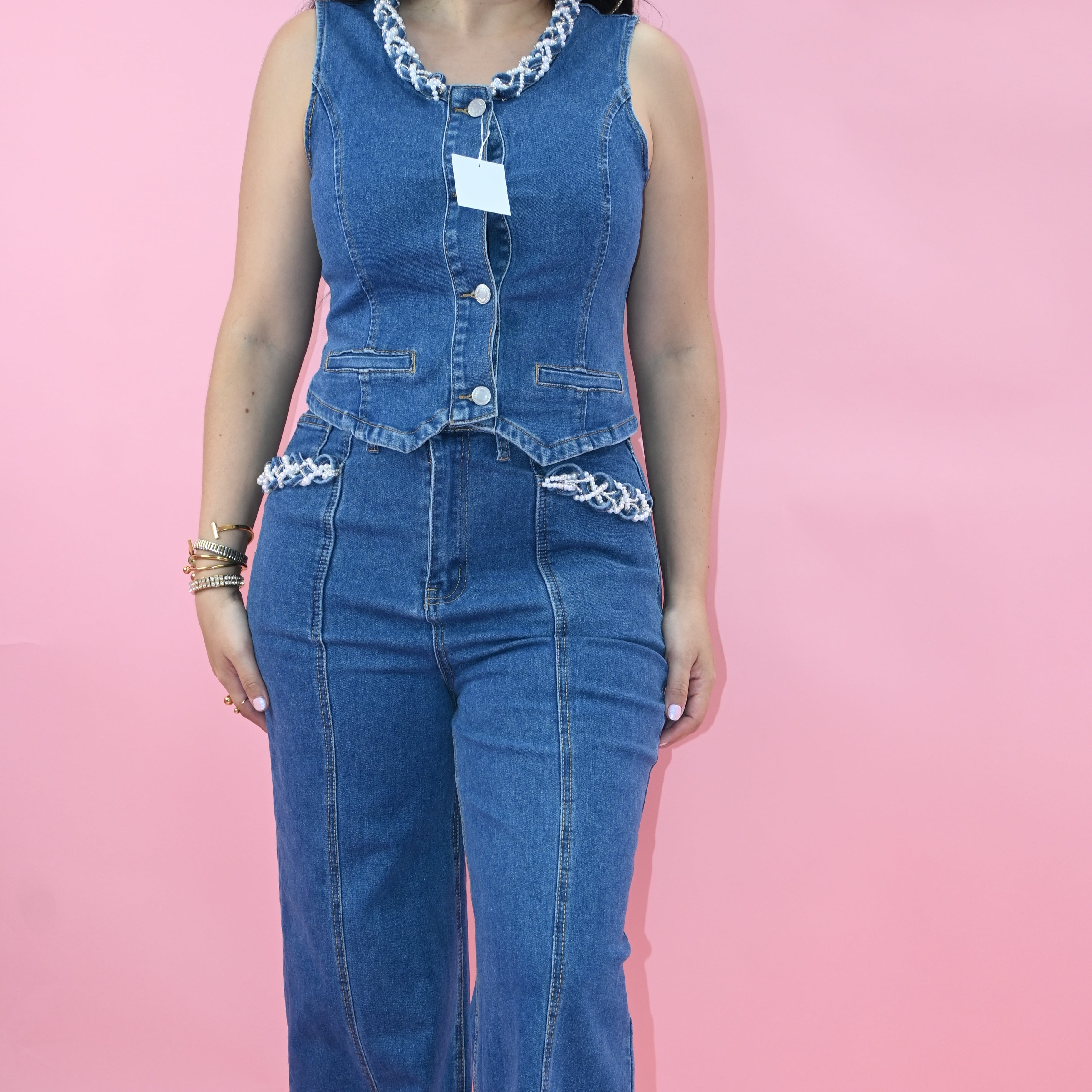 Set de 2 piezas en pantalon y top con perlas, su tela estira un poco.