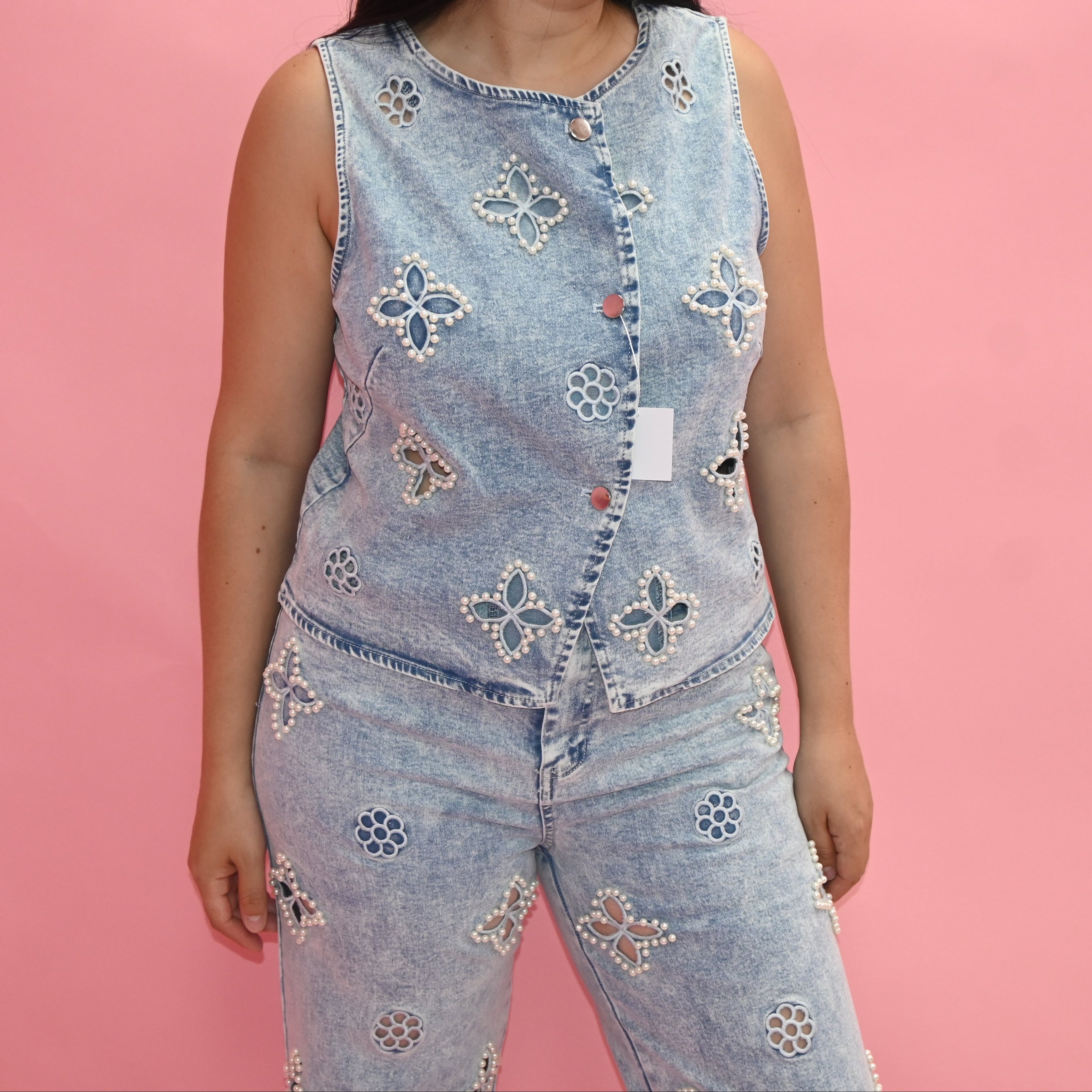 Set de 2 piezas en mezclilla, su tela estira tiene diseno en perlas.