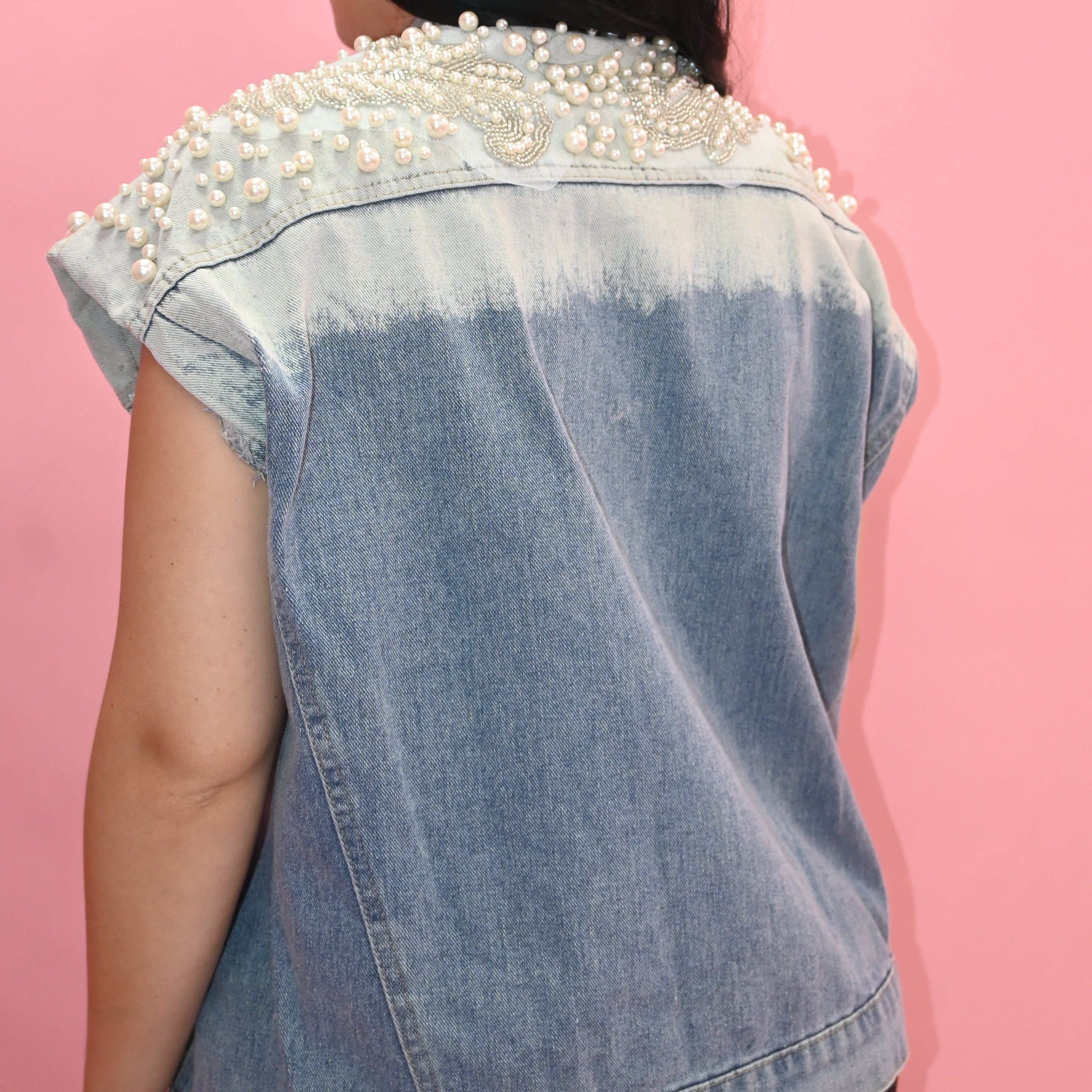 Chaleco de mezclilla con aplicaciones en perla la tela no estira.