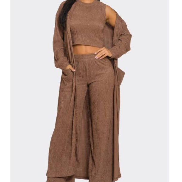 *** New Style *** 3 PIECE SET - Crinkled Rhinestone Cardigan Crop Top Loungewear Pant Set CARDIGAN /CROP TOP/ WIDE PANTS SET. - Rhinestone - Crinkle Texture - Sleeveless crop tank top - Elastic waistband pull on wide leg pants - Long Cardigan 92%Polyester 8%Spandex