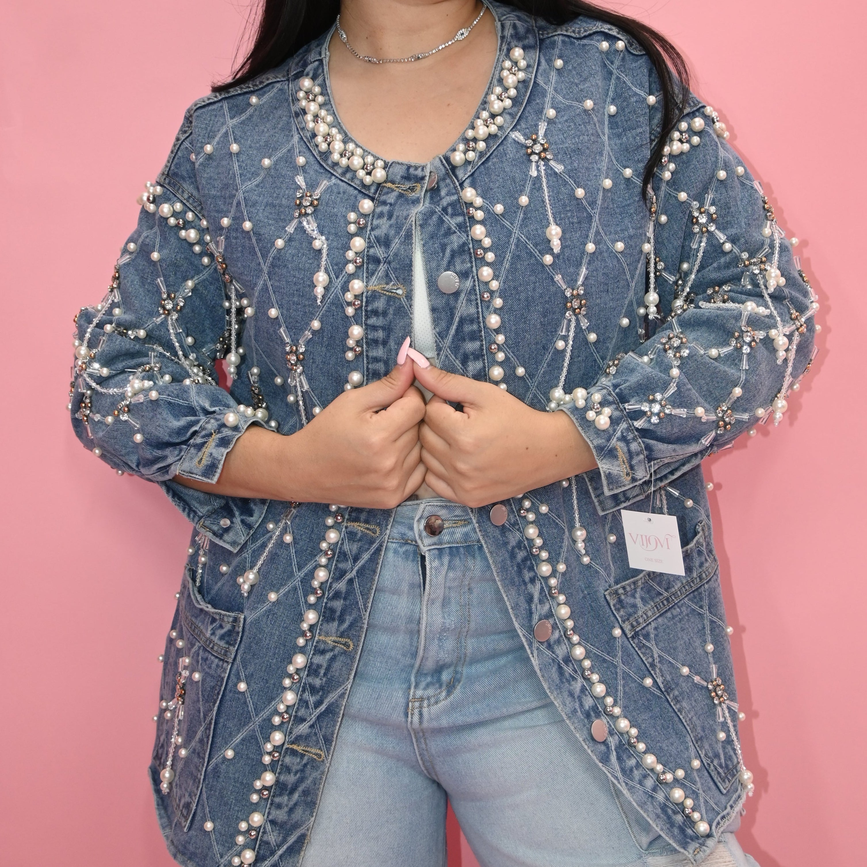 Chaqueta de mezclilla con aplicaciones en cristales, corre a su talla no estira la tela, es unitalla.