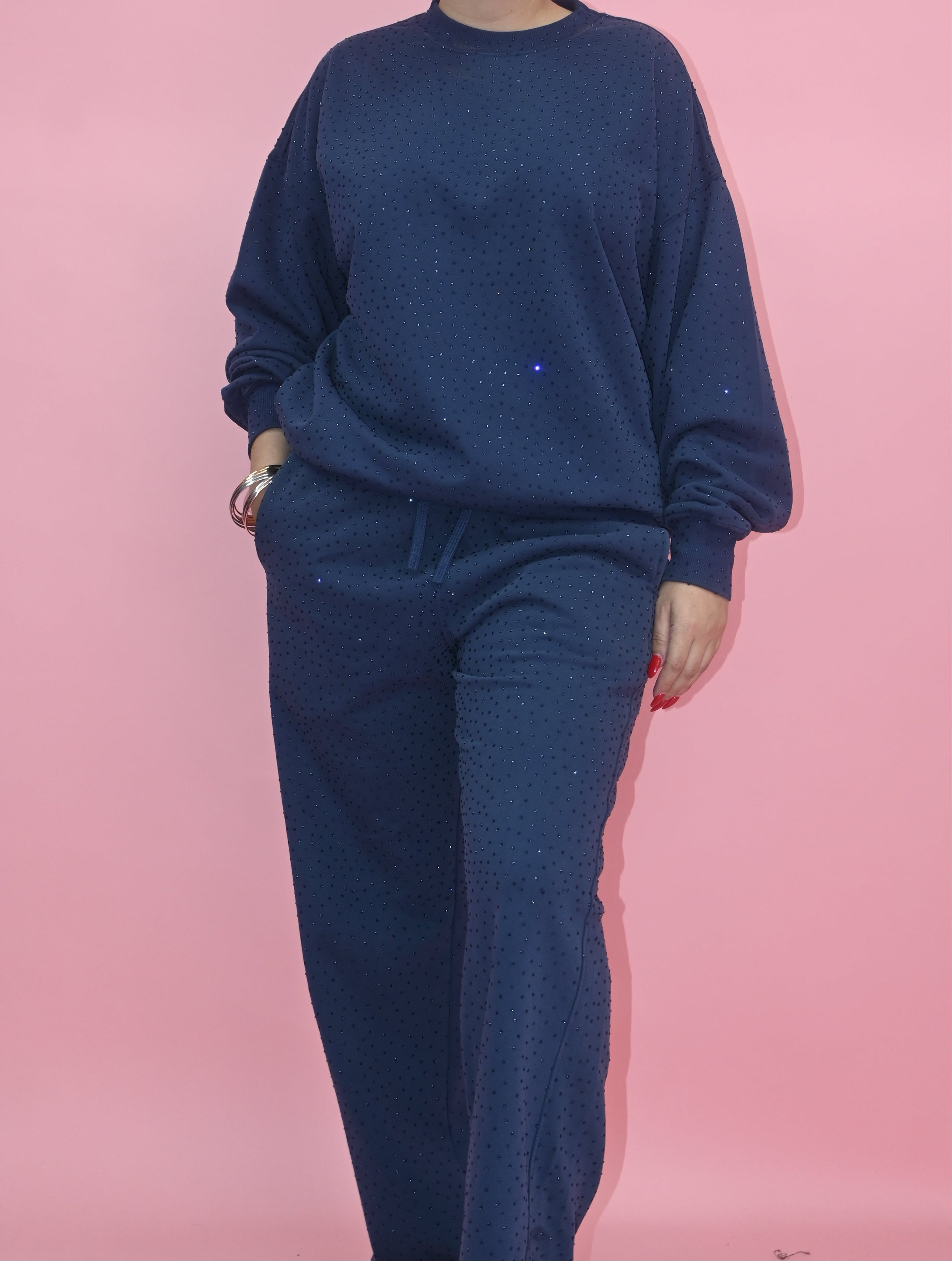 Set 2 piezas en pantalon y sueter con cristales, el pantalon casi no estira y el sueter es ligeramente amplio.