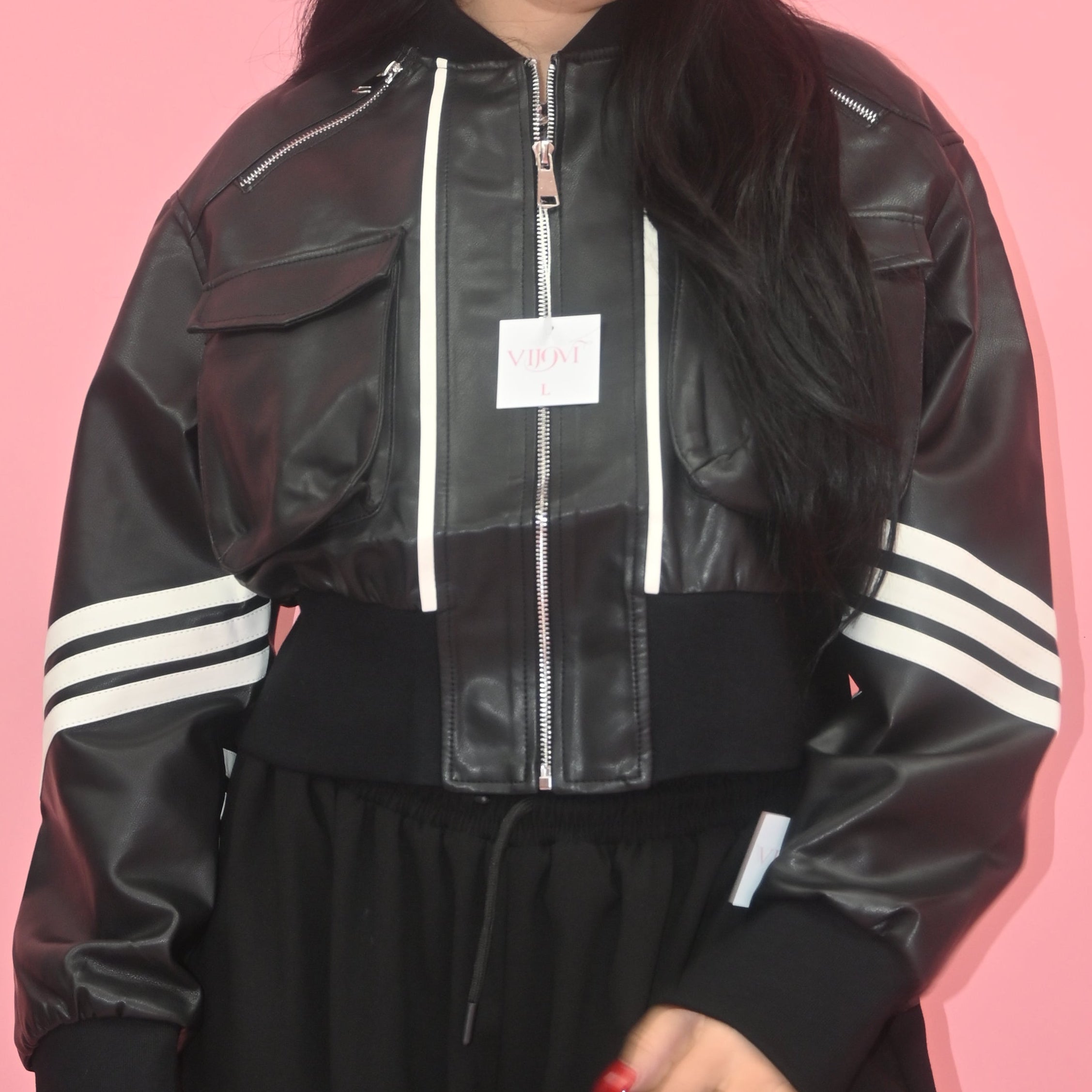 Chaqueta de vinil corta con lineas en blanco, corre a su talla.