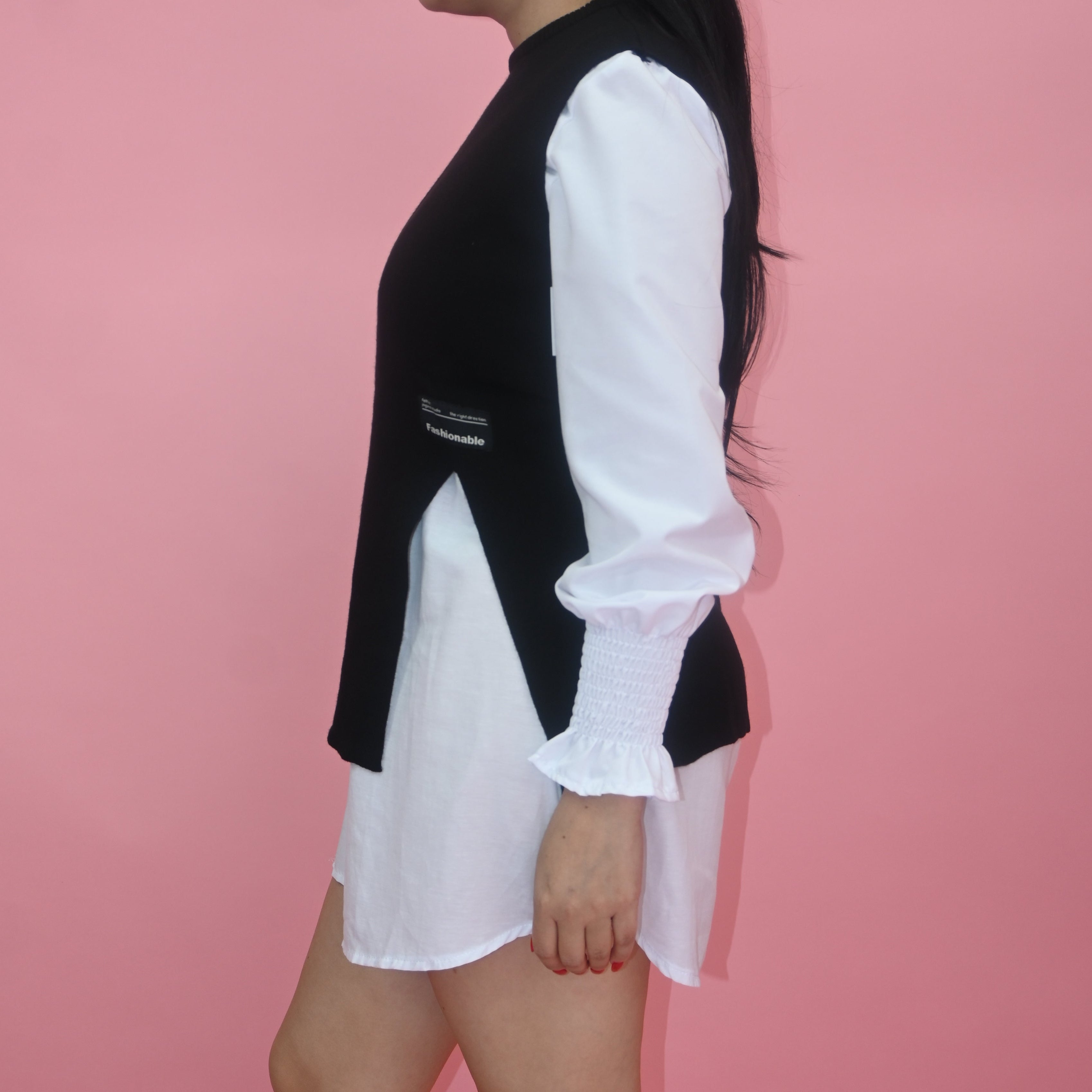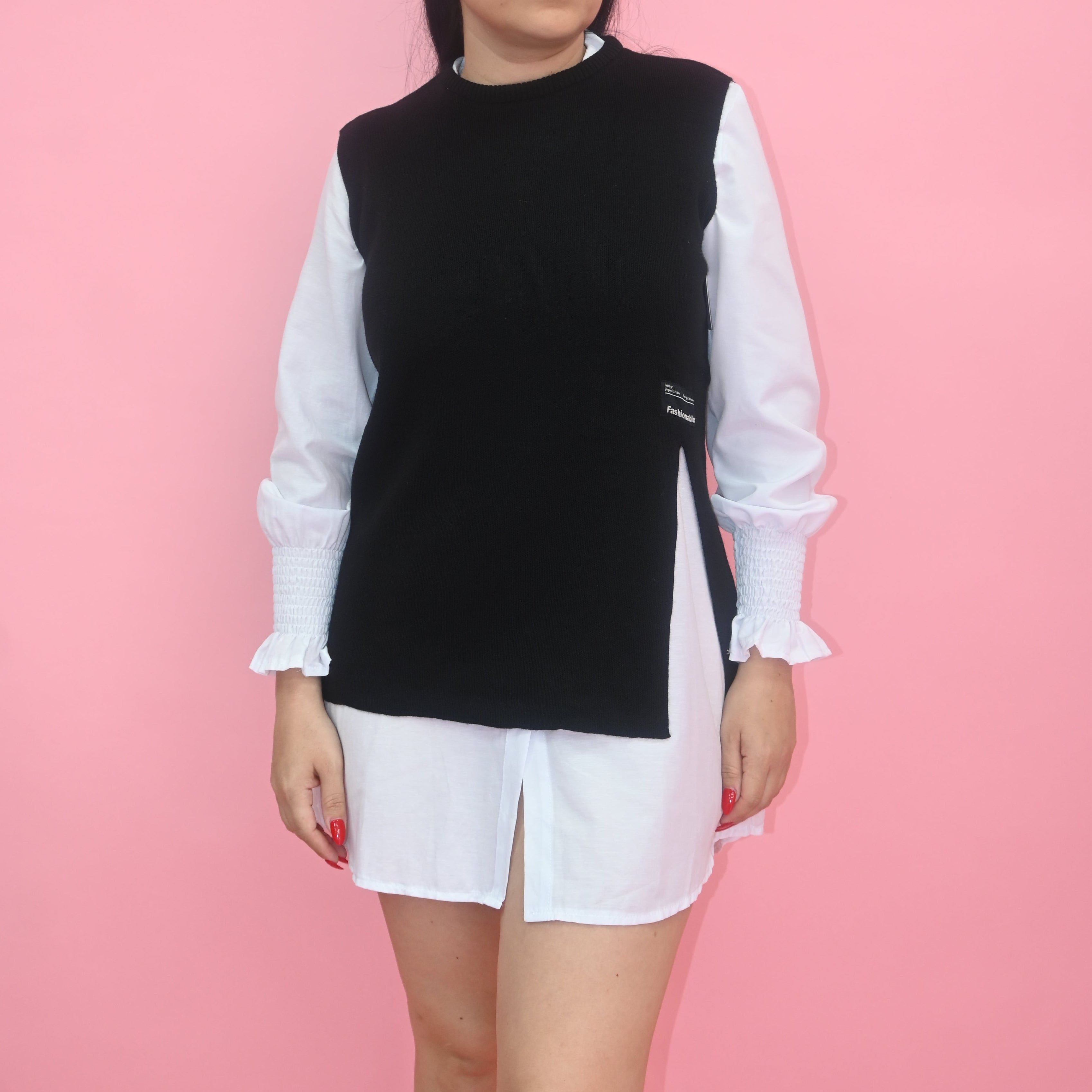 Vestido corto tipo bluson con sueter y cinto incluido, corre a su talla no estira la blusa blanca solo el sueter.